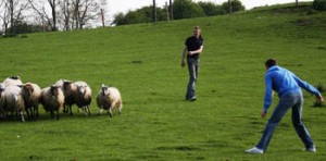 Sheep Herding – this can take a number of formats – Sometimes we form a human pen with the group and get the dogs to take the sheep up close and personal, into the middle of the round the barrels, through the gate and into a pen!“pen”. We also have fantastic fun getting the teams to guide a group of sheep through a series of gateways!